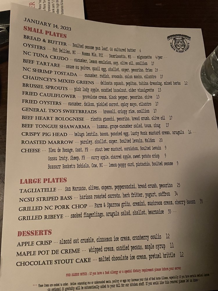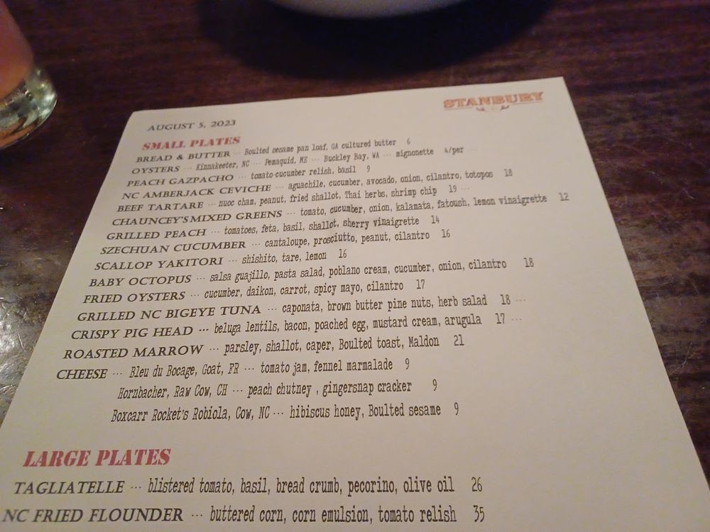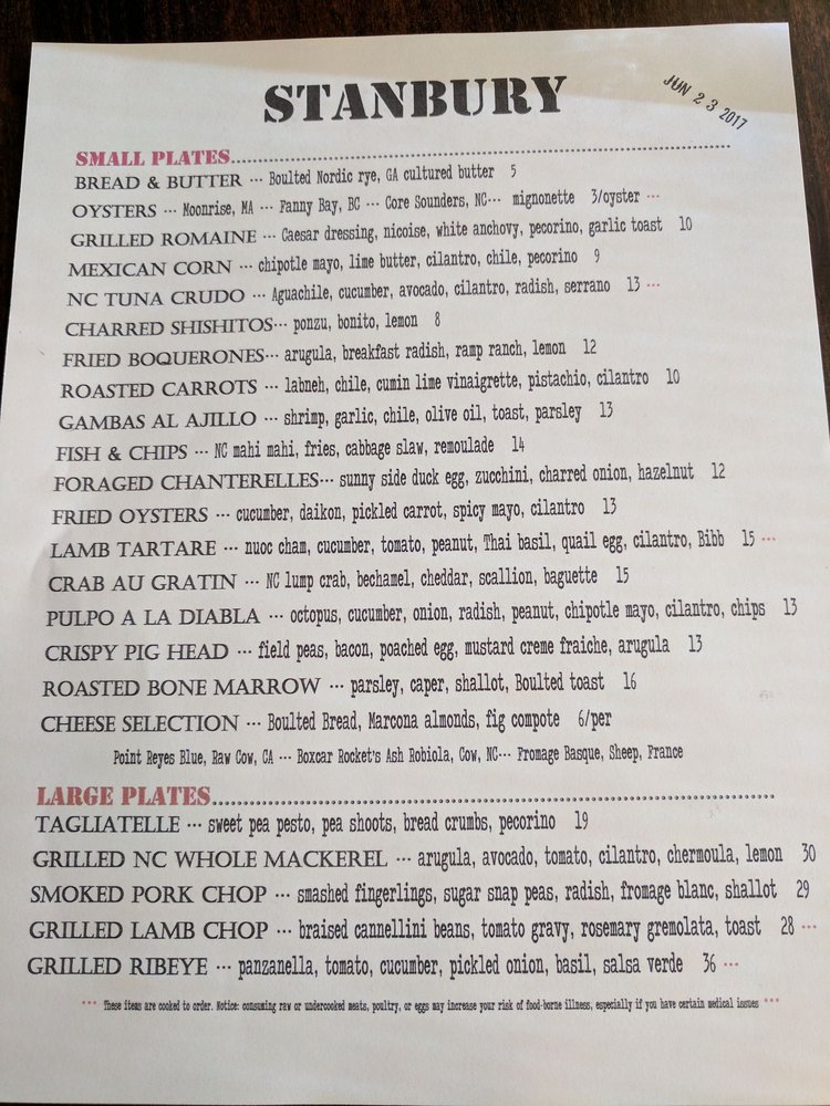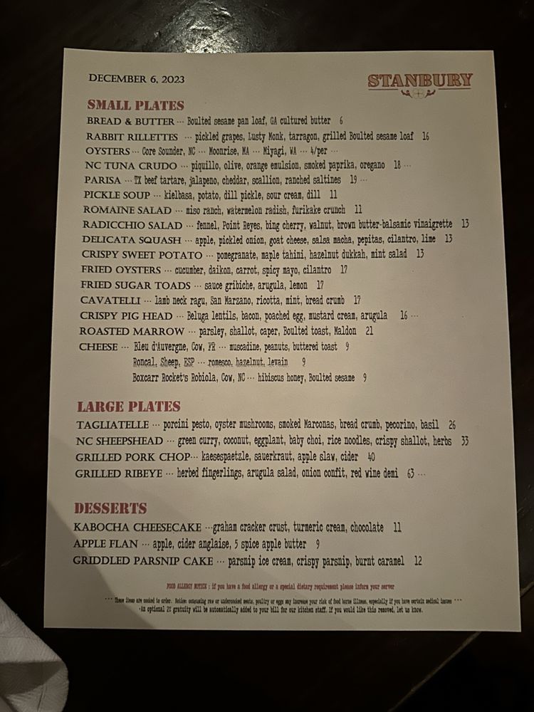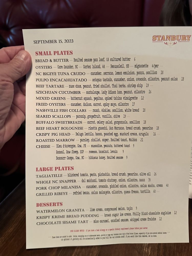 Introducing Stanbury, a trendy and upscale restaurant located in Raleigh, NC. Known for its ever-changing menu and creative dishes, Stanbury offers a culinary experience like no other. Some highlights from the menu include Boxcarr Campo Raw Cow, NC, boulted levain, marcona almonds, fig, Mushroom Bisque with smoked marconas and crema, and Arugula Salad with apple, fennel, and hazelnut. The beverage options range from Mexican Coke to Mountain Valley Sparkling water. Customers rave about the attentive wait staff and the deliciously crafted seasonal cocktails. Stanbury is a must-visit for those seeking a unique and unforgettable dining experience.
